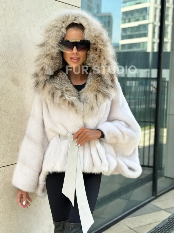 Белое норковое манто с капюшоном из меха рыси 100574