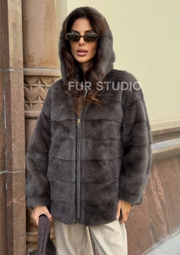 Бомбер из меха норки с капюшоном - цвет мокко 100735
